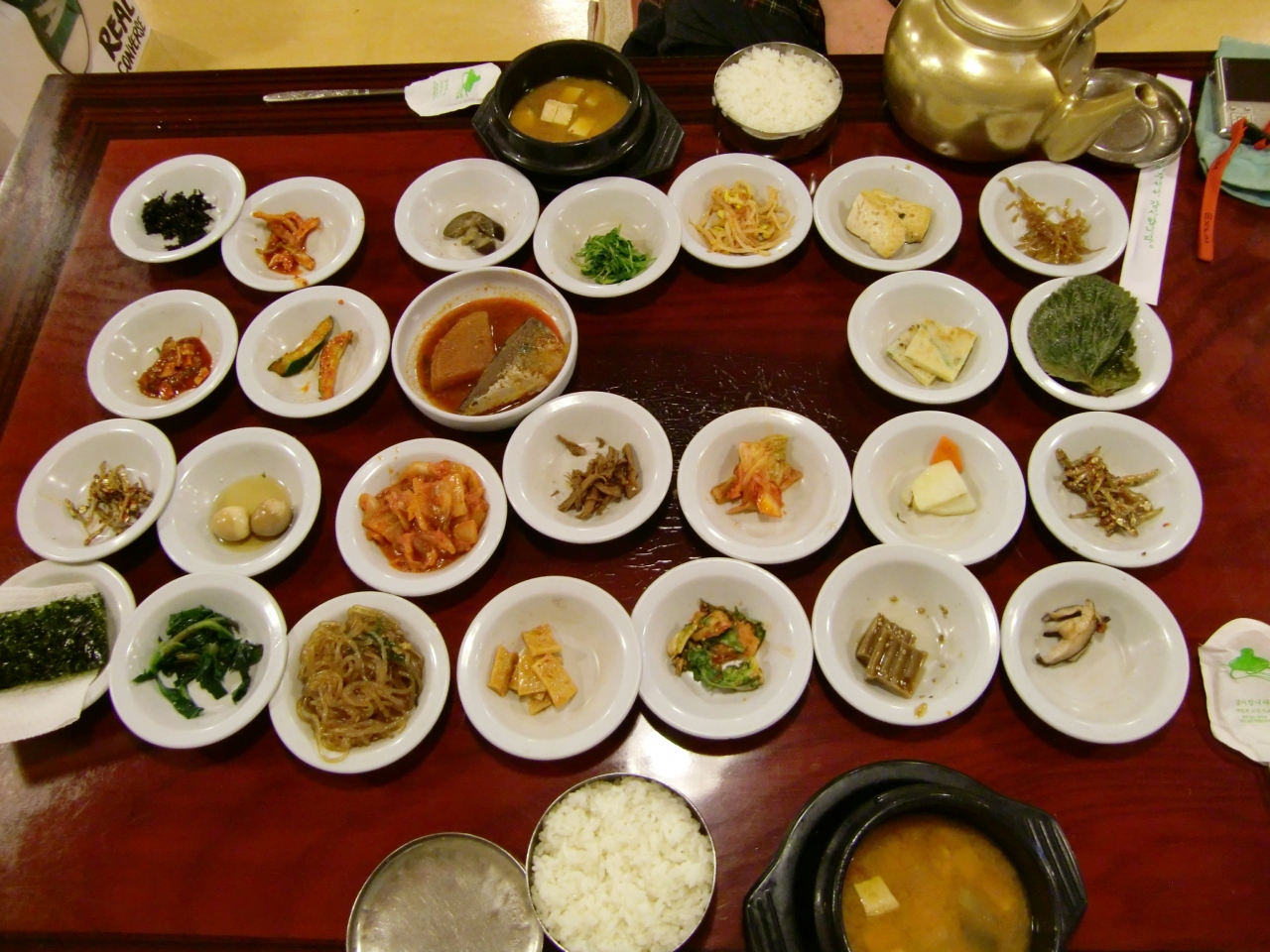 サバの煮物やら小魚の佃煮風、チャプチェやキムチ・韓国のり、どんぐりで作ったこんにゃくみたいなもの、おいしいもの、そうでないもの、まぁそれなりに・・。 もちろんそれぞれにお代わりできるみたいです。