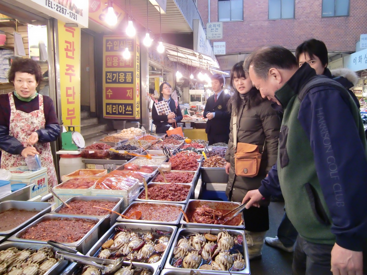 お店で食べるカンジャンケジャンやヤンニョムケジャンは1匹25000ウォンもします。おいしいけど高くってお土産にできないかも・・。でもこのお店のケジャンは1kgで25000ウォンなのです。ご主人は市場では珍しく日本語OKです。カードもOKです。ヤンニョムケジャン1.7kg・するめのキムチを1kg・チャンジャを0.5kgで70000ウォン(¥4620)でした。微妙に足が折れていたりはしますが、味は同じです。味見もたっぷりさせてくれて、ヤクルトやらゆず茶やら頂きました。