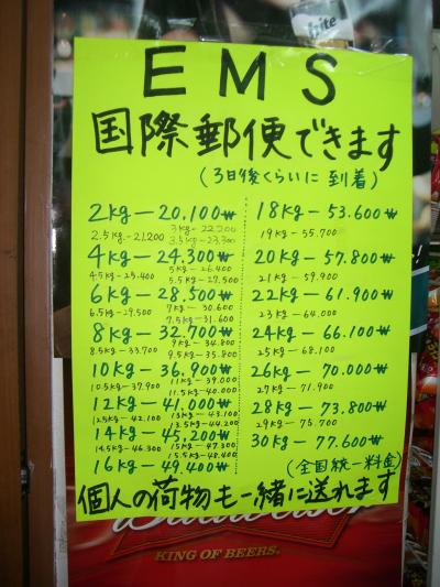 買物の荷物が多いということで海外で始めて利用したEMS。ホテル近くのドリームマートで9日夜に頼んだところ、12日午前中に届きました。日本国内だったら九州でも北海道でも同じ料金のようです。料金は重さで異なるようで、10.5kgで36900ウォン(¥2450)この安さと速さは感動ものです!詳しくはこちらで・・ http://4travel.jp/traveler/mamimama/album/10312958/