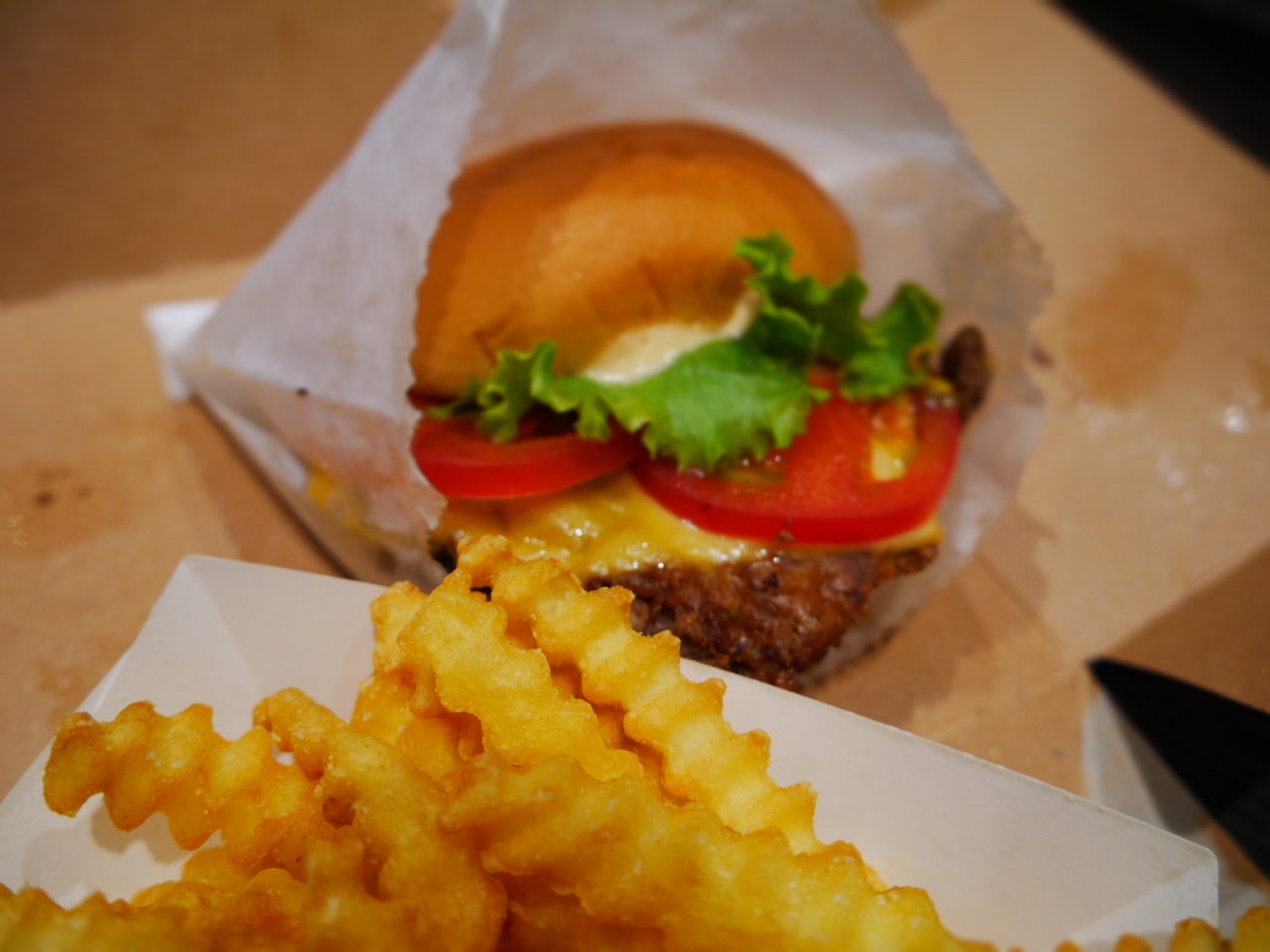 日曜日の昼時に行ったので、覚悟はしていきましたが、やっぱり行列ができていました。約50分程待って注文、その後受け取りまで10分ってところでしょうか。店内も外の席も満席だったので、テイクアウトで注文。かわいい袋に入れてくれます。肝心のお味は、あまり期待していなかったのですが、美味しかったです。お肉の味もしっかりしていて、バンズもふわふわ、もちもちで美味しいです。こちらはミルクシェイクもいろんな種類や限定フレーバー等があるので、ハンバーガー以外も楽しめます。
