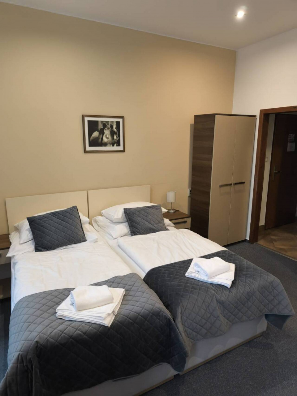 ブルノ市にあります、広めのお部屋が素敵なホテルです。チェックインすると朝ごはんとなる食材が部屋にあったり、フルーツやパンなどはドアかけてあったり、食堂ではなく各自お部屋で頂くスタイルとなっています。自分の好きなときに食べることができますし、身支度をして食堂に行く必要がなかったのがとても楽でこのスタイル他のホテルも真似したらいいのにと思いました。部屋のインテリアも白と水色がとても清潔感をより感じさせてくれます。