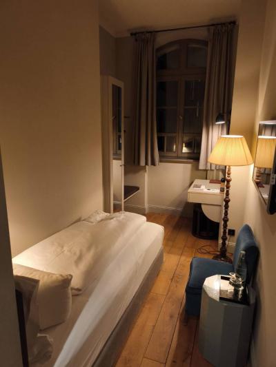 モダンな内装がとても私のタイプのホテルです。立地もよくベルリン観光にアクセス抜群でした。ベッドの硬さもちょうどよいです。ただ、ちょっと日本のシングルより細めのベッドかも。暗めの照明で夜になると落ち着いた雰囲気の室内で入眠しやすかったです。細長い形状のお部屋でしたが窓はそこそこ大きくて日当たりもよく、朝は気持ちよく目覚めることができたのがよかったなと思いました。