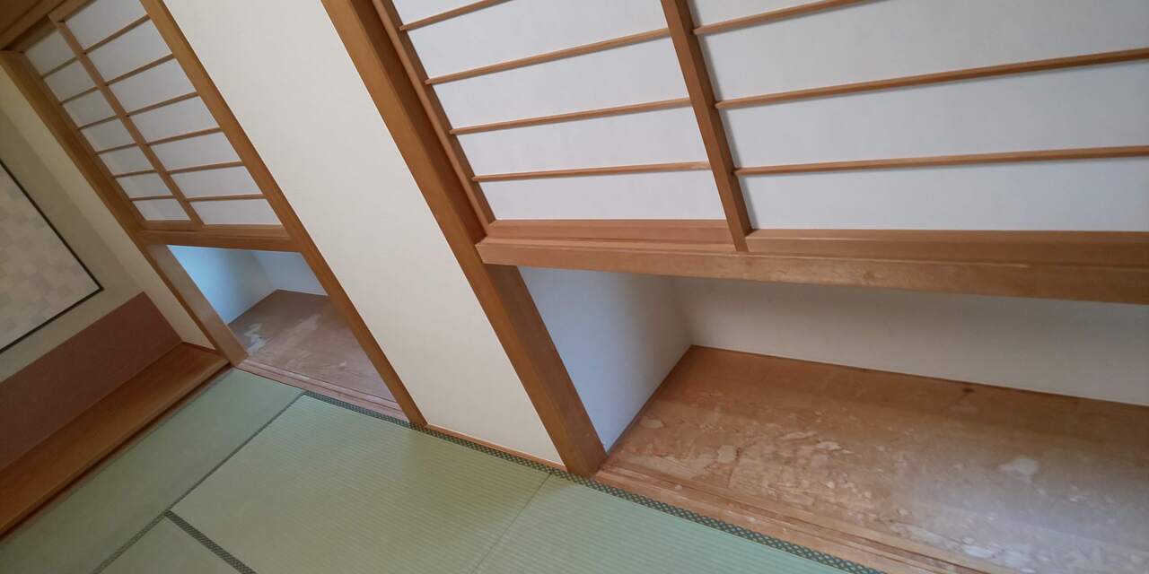 障子のつくりかわおもしろく、開けしめできるタイプではなく、動きません。障子は床から50十センチあがっていて障子をくぐると窓の景色が眺められます。むやみに障子をさわらないでも窓から景色を楽しめるので、子供が障子をいたずらしてしまう防止にもなっているのかなと思いました。