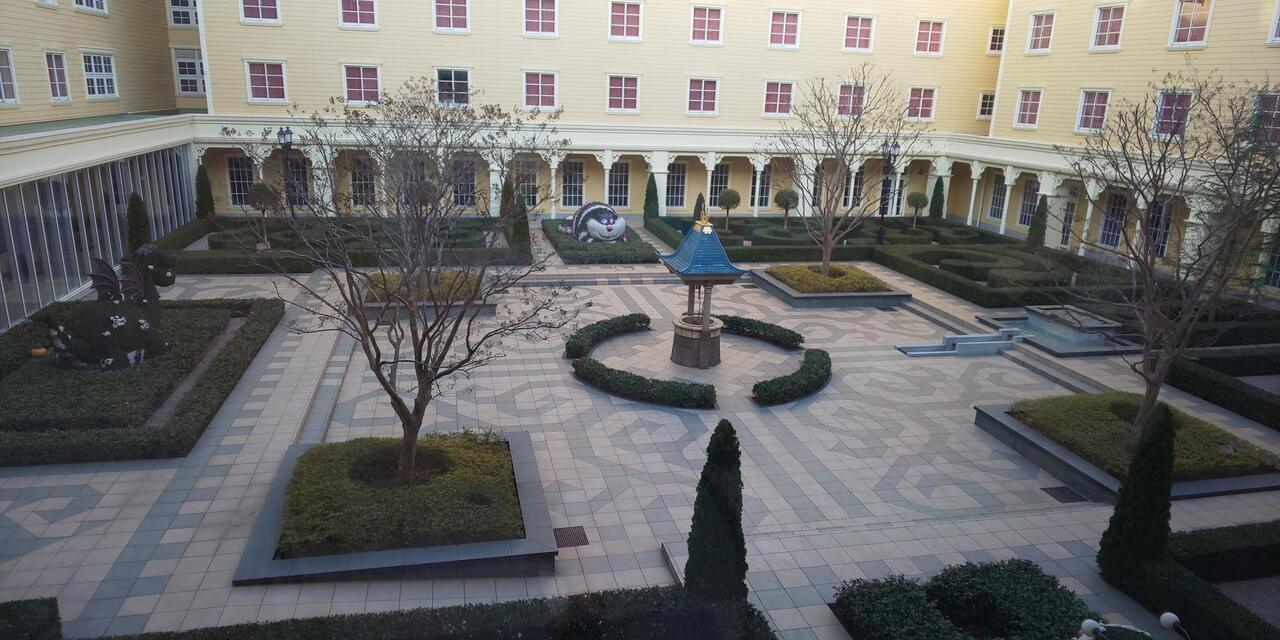 ディズニーのホテルの中ではリーズナブルに泊まれるホテルで、部屋のソファもベッドに早変わりしますのでファミリーに人気なのが頷けます。ホテル内にはお土産屋さんも完備されていますのでパークで買い忘れたものを買うこともできてとても便利でした。中庭を囲むように造られたホテルで中庭のオブジェを窓から眺めることができました。狭い部屋ではあってもトイレ、洗面所、浴室は狭いですが全てセパレートになっているのでディズニーさすが!というかんじです。