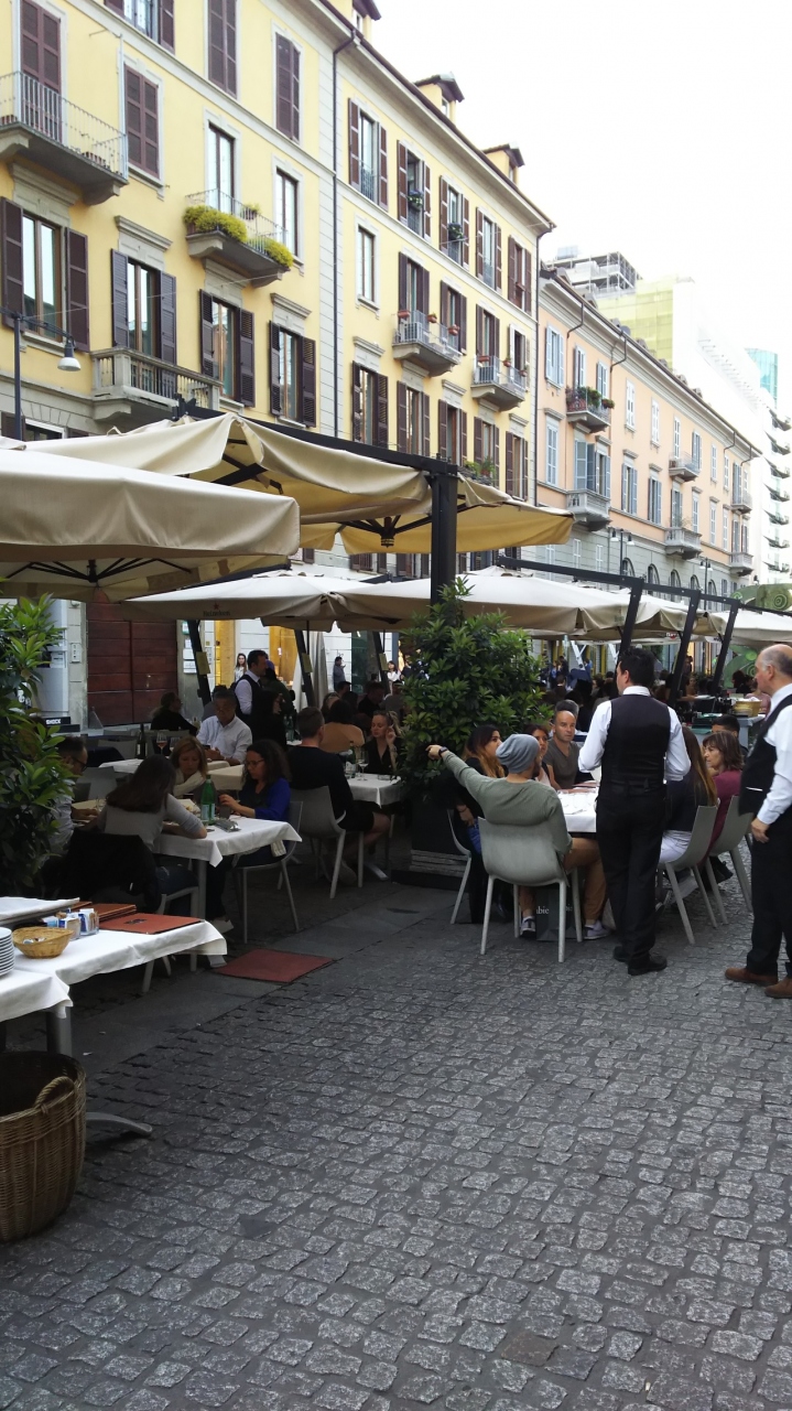 夕方のアペリティーボの時間帯になるとレストランの客引が多くなり、レストランやその屋根のしたで食事を楽しんでいる人が多く見られました。