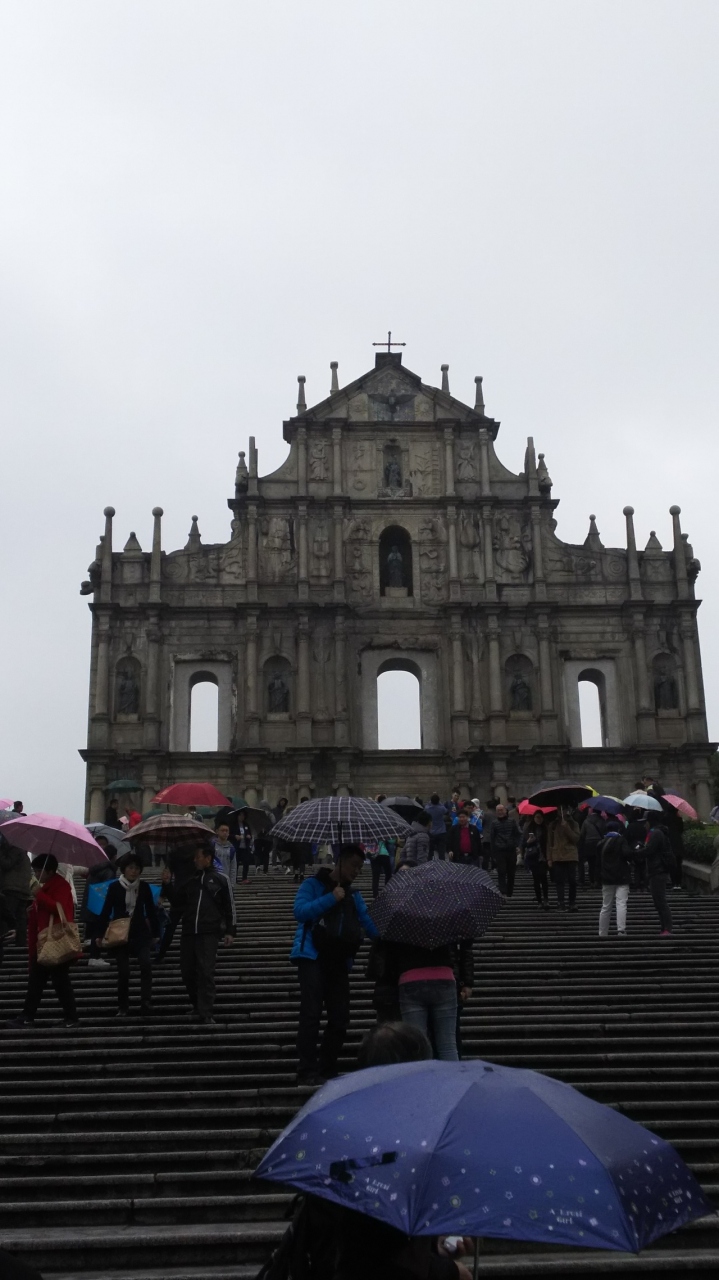 マカオ世界遺産のひとつ、聖ポール天主堂。1600年代に建てられたローマよりも東では最も美しい教会と言われていましたが、火災により今のような正面壁のみ残る姿になってしまいました。