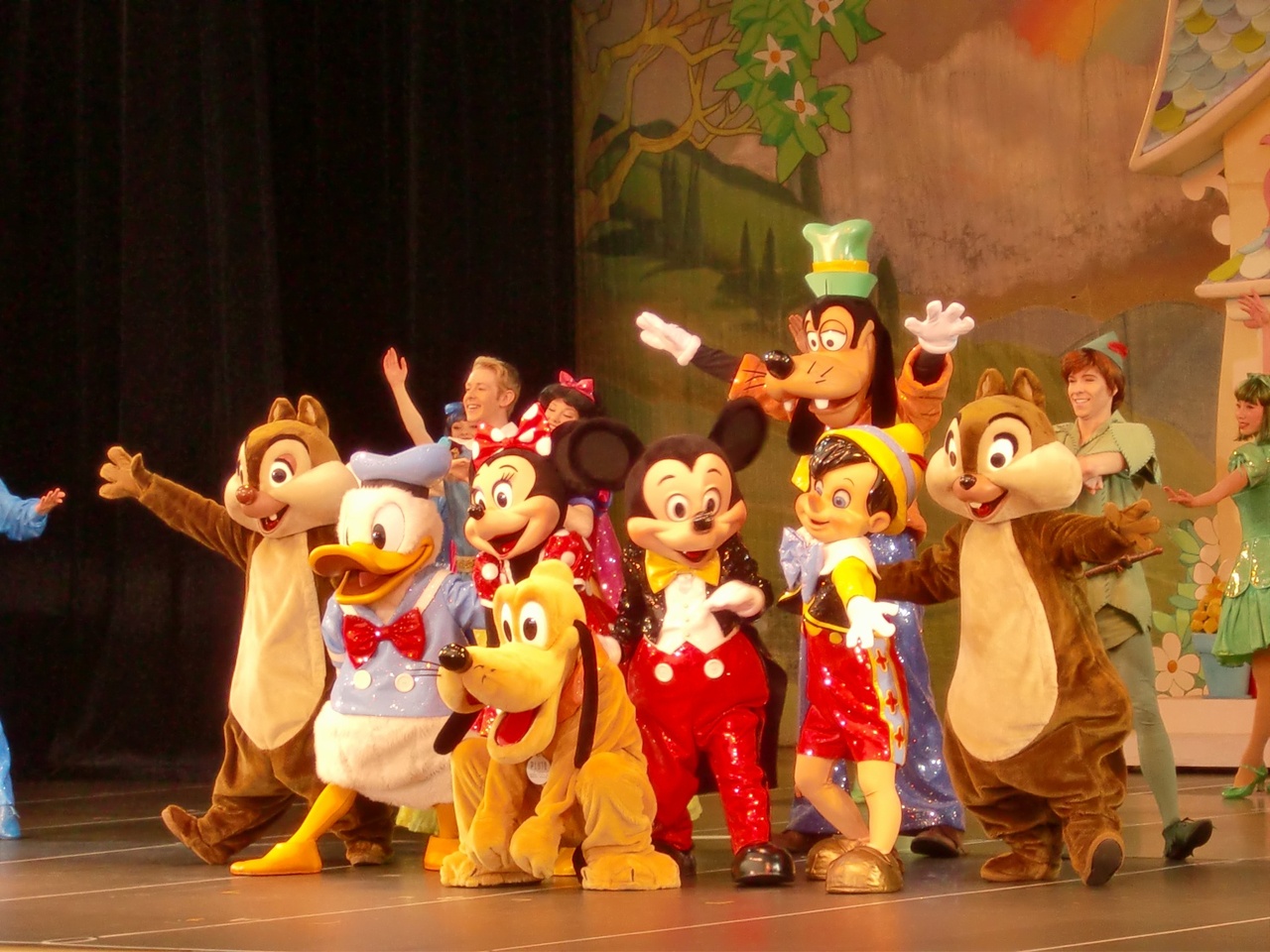 白黒のミッキーミニーが登場するところから始まり、ディズニーの映画のテーマソングにあわせてキャラクターたちが踊ります!