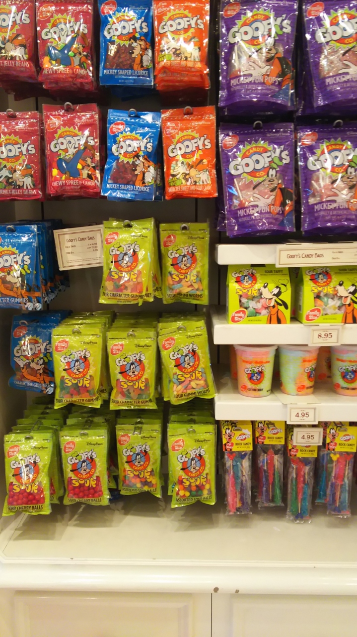 カラフルなぐるぐるキャンディや、たっぷりお砂糖をまぶしたグーフィーのパッケージのグミなど色に溢れていてかわいいお菓子屋さんでした。どうやって食べるの?と思うようなサイズのキャンディもありました。