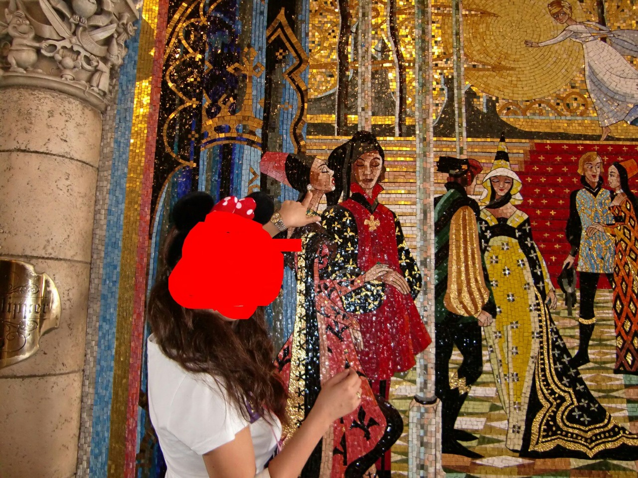 シンデレラ城のなかに入り、少し進むとタイルの壁画があります。小さなタイルを貼り絵のようにして絵をつくってあるのですが、その小さなタイルをひとつひとつくまなく探すと、タイルではないキラッとした一粒のガラスが!!