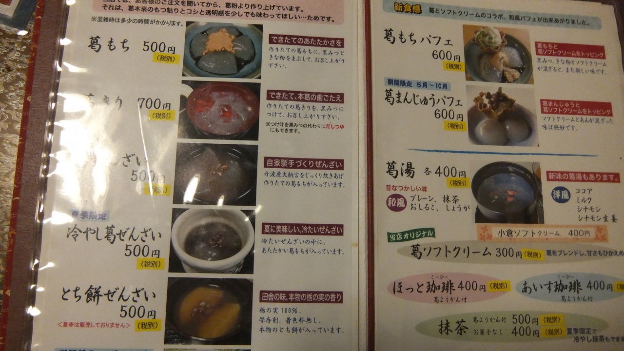 他には、葛ぜんざい、とち餅ぜんざい、葛まんじゅう、葛きりなど、魅力的なラインナップ★