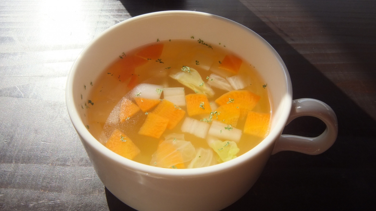 スープはお野菜たっぷりのコンソメスープ、お野菜の甘みが口いっぱいに広がります。