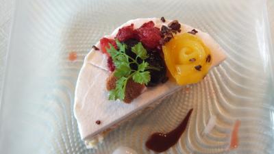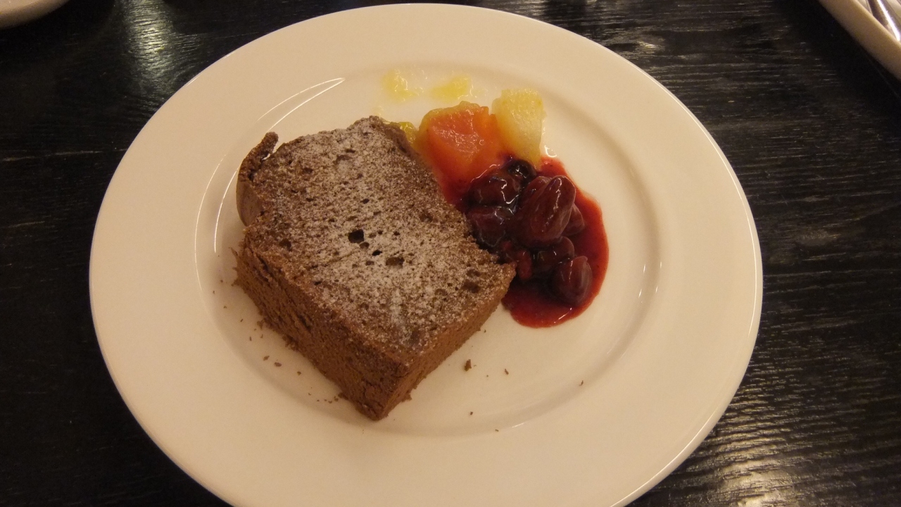 チョコレートシフォンケーキにベリーとフルーツのソースを添えて