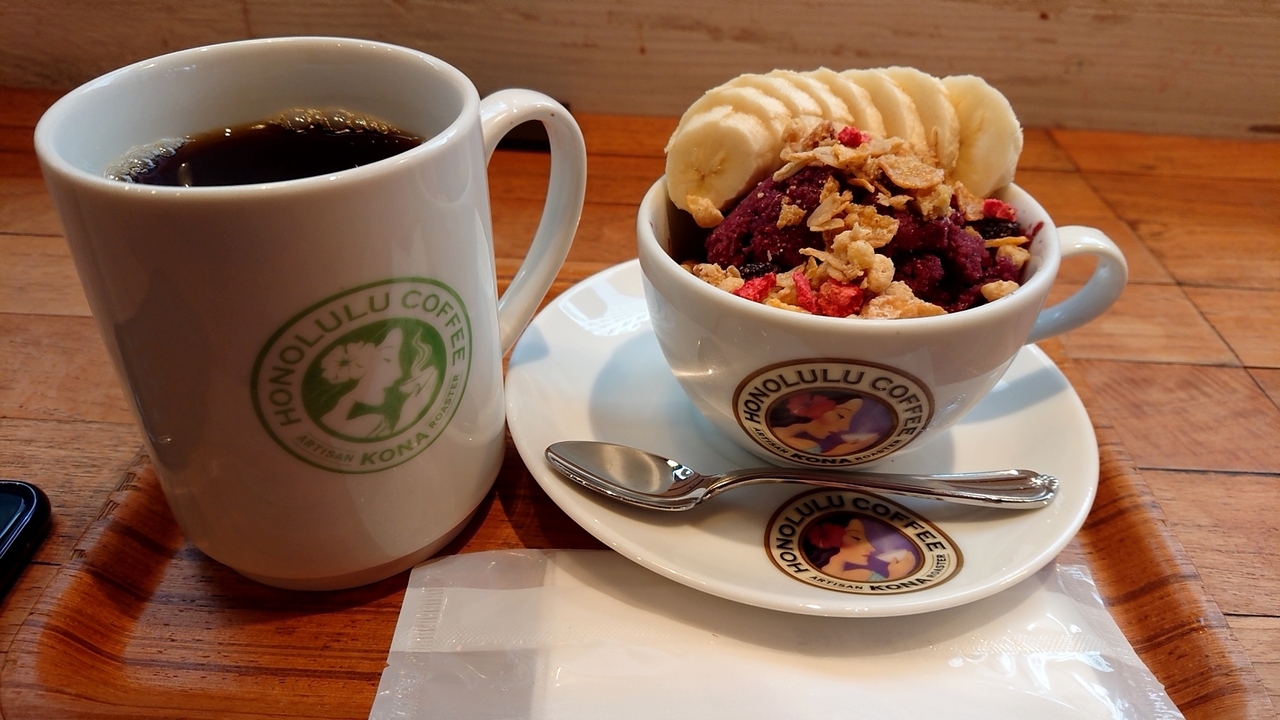ハワイアンミュージックと、フレーバーコーヒーとアサイーで、気分だけでもハワイです。