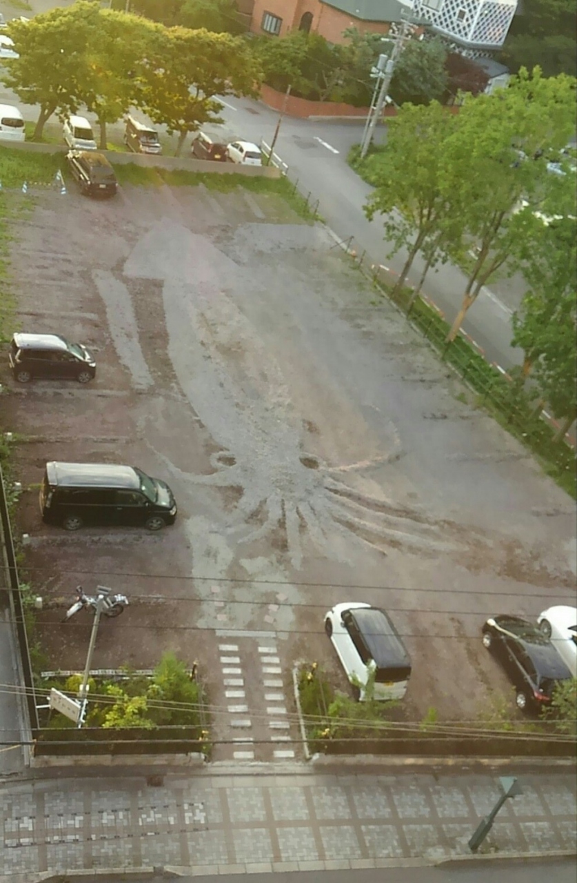 お部屋の窓、バルコニーから、駐車場にイカが描かれているのが見えました♪- 旅行時期