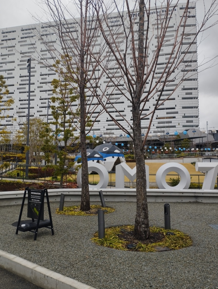 新今宮駅のホームからライトアップされたOMO7ホテルの建物が良く見えます。建物外観がライトアップされていて、とても洒落です。