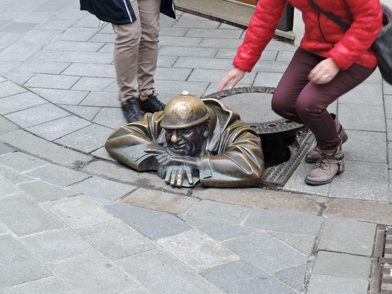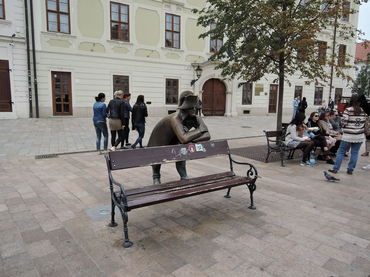 有名なチュミル像、スロバキア語で「のぞき屋」の意味。ベンチに寄りかかる貴族の像。