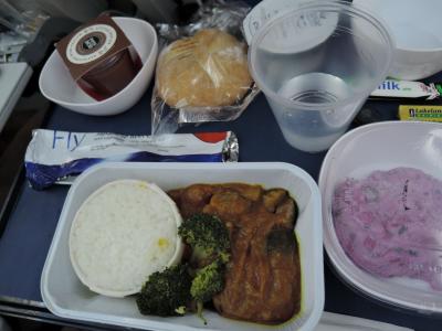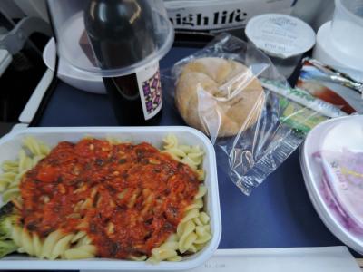 機内食の夕食:ビーフとマカロニの2種類から選べます。ご飯が美味しかったです。
