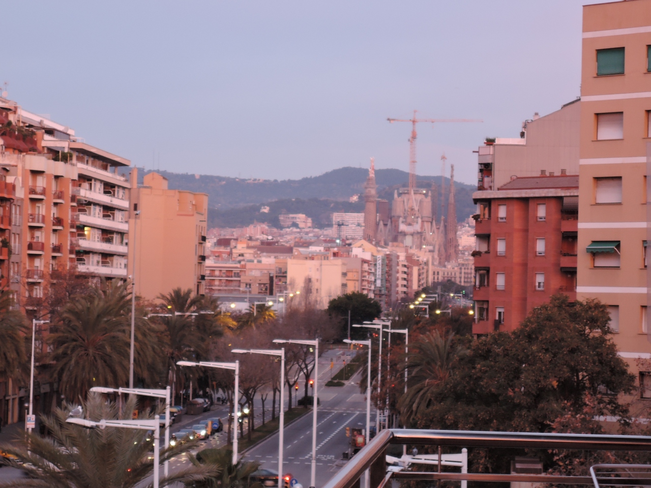 テラスからはサグラダファミリアが見え、前の広い道路もヤシの木の街路樹がおしゃれです。