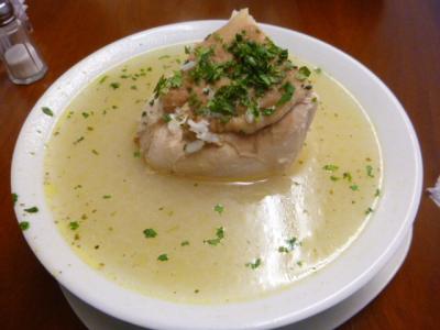 豚肉を揚げた塊(740円)と大きな鶏肉入りスープ(555円)。