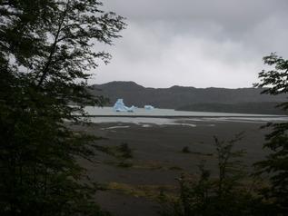 向こうのグレイ湖に氷河が。青い氷河が浮かんでいます。