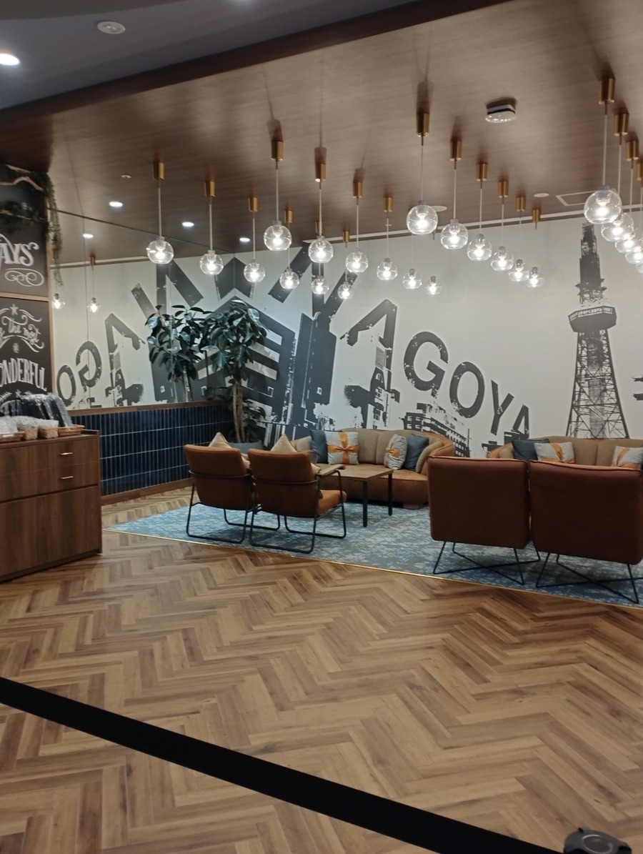 ロビーがお洒落で、壁紙に名古屋の名所が描かれています。