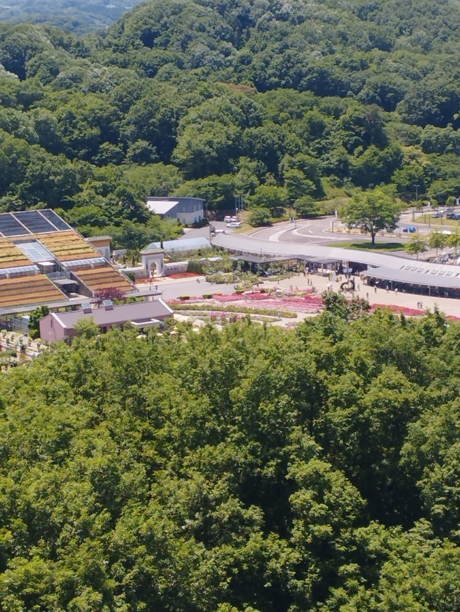 園内の花のタワーに登りました。2階展望台からの眺めは最高、カフェの生搾りバラの生チョコモンブラン 1,500円が美味しそうでした。- 旅行時期