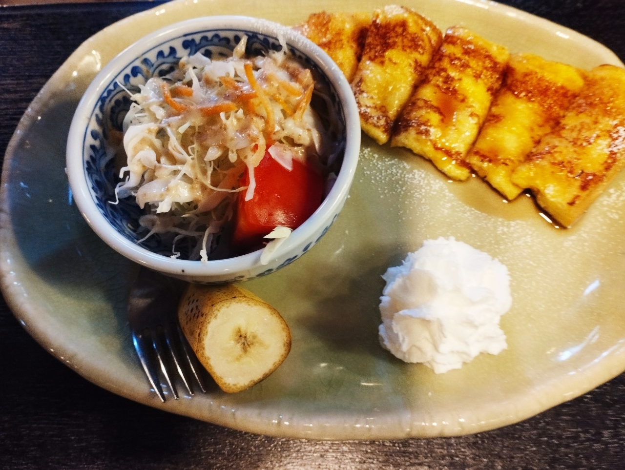 プレーンワッフル、モーニング・ビッグ食パン付き、フレンチトーストを注文しました。