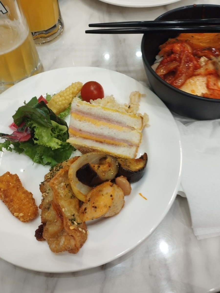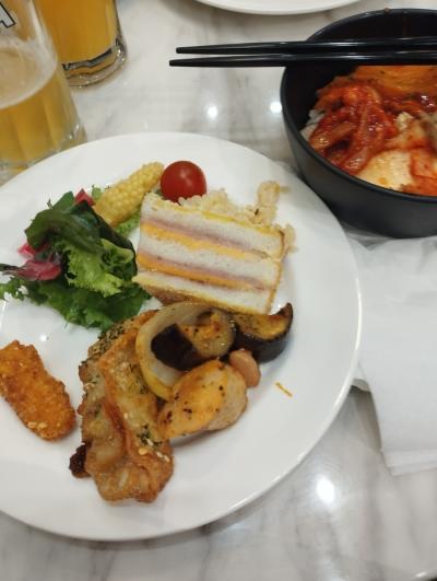 食べ物が豊富、サンドイッチ、揚げ物、ビビンバ、ビールなどをいただきました。カップラーメンの種類が多く、激辛のものもありました。- 旅行時期