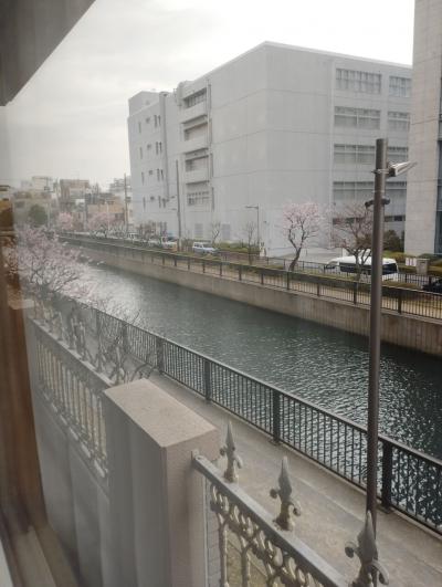 朝起きて窓の外を見ると川が流れていて、桜も少し咲いていました。素敵な立地のホテルです。