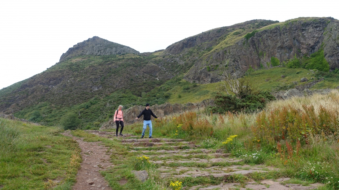 ホリルード公園はエジンバラ市街の東に広がる広大な公園で、かっては王家の狩猟場だった。街から眺めると緑の公園の背後にソールズベリ・クラッグスと呼ばれる台形状の断崖が続き、その奥に2つの小高いピークが見える。このピークの一つが古代イギリスの伝説の王アーサーの玉座が置かれていた場所と言われている。
