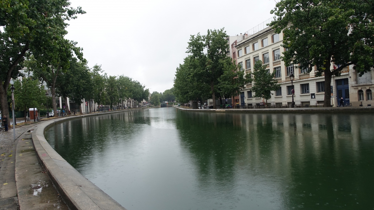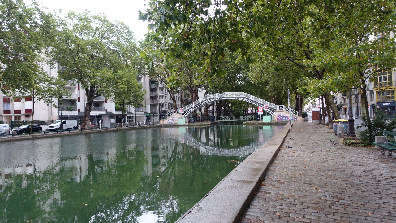 運河に沿って如何にもパリらしい石造りの建物が続き、緑のマロニエの並木が美しい。運河は並木を写して緑色に見え、そこに太鼓形や台形型など様々な形の橋が架かっている。フランス映画「アメリ」で主人公が水切りをして遊んだシーンがあるらしい。