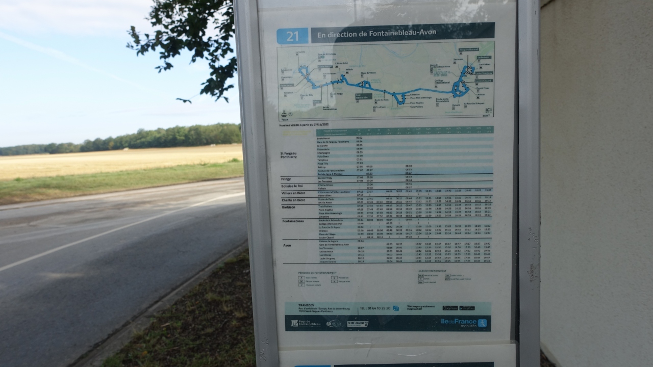 バルビゾンに行くには鉄道駅であるフォンテーヌブロー・アヴォン駅から直行バスが1日9本運行されている。駅から村まで片道20分余りで、途中にフォンテーヌブロー宮殿の前を通る。他にムランからのバス便もあるが途中で乗換が必要のようだ。バルビゾンは小さな村でバス停は東入口、中央、北入口の3か所しかない。この中で北入口にあたるBarbizon Trois Poiriers で下車すると、目の前にミレーが「晩鐘」を描いた麦畑が広がっている。- 旅行時期