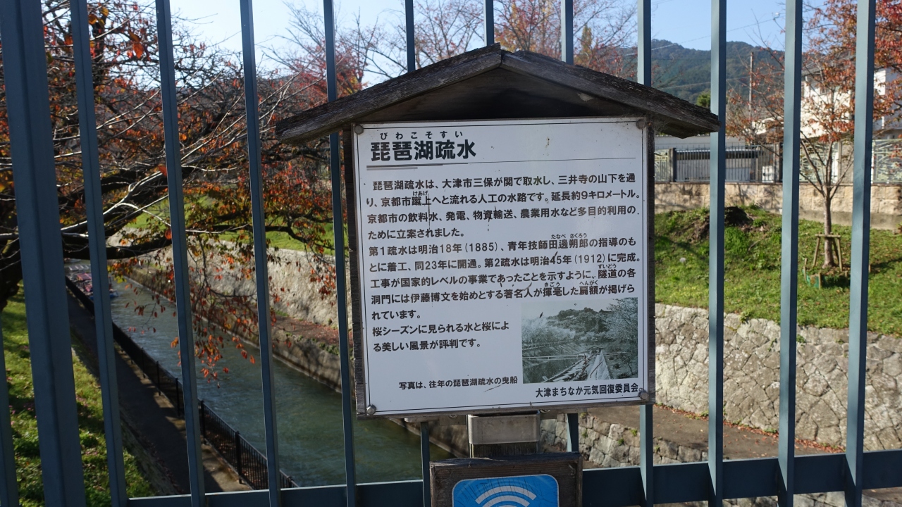 琵琶湖疎水というと煉瓦のアーチが残る南禅寺や発電所やインクラインがある蹴上など京都側が有名だが、琵琶湖からの取水口のある大津側も地味だが見どころがある。特に春には疎水の上は桜のトンネルになり、観光船が運航している。疎水は京都に至るまでいくつものトンネルを潜り、水路のいたる所に明治の元勲たちの扁額がある。これらを辿りながら京都まで歩くのも面白い。- 旅行時期