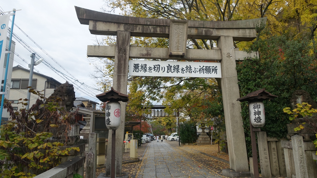 京都には縁結び、縁切りにご利益のある寺社仏閣が多いが、この神社もその一つ。祇園の奥まった一画にあり、東山安井バス停で下車すると通りの西側に鳥居がある。