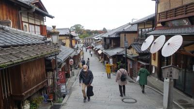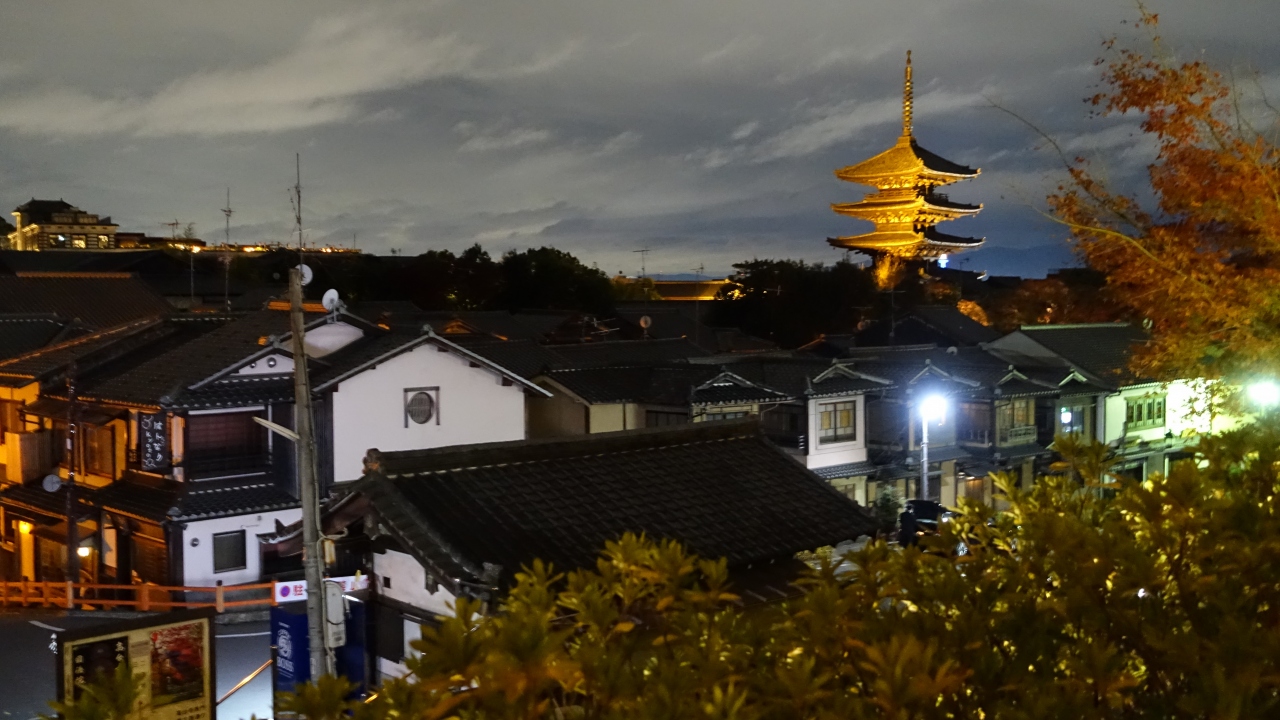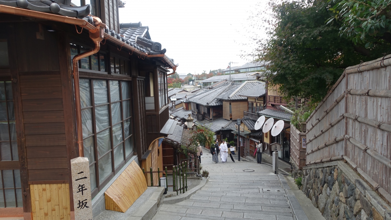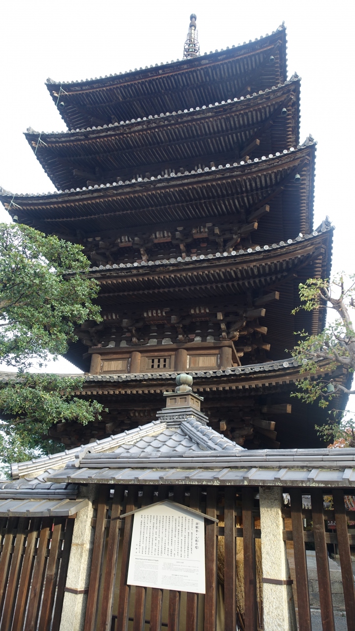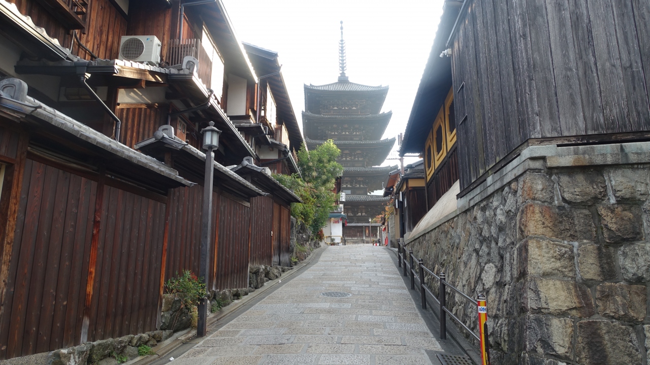 清水寺の塔が三重なのに対し八坂の塔は五重で、両者は並んで東山のシンボルになっている。産寧坂から眺めると町家の瓦屋根が連なる家並の上に塔が抜きんでて見えるが、八坂通りからの眺めもなかなかフォトジェニック。石畳の狭い通りの両側に風情ある町家が並ぶ八坂通りの正面に五重塔の全景を見ることが出来る。塔と町家と石畳の組み合わせはいかにも京都らしい。八坂通りは日中人通りが多いので、出来れば早朝の静かな時間帯に歩きたい。