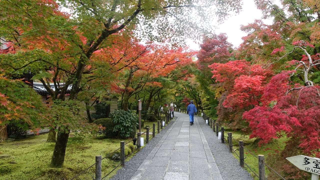 数多ある京都の紅葉名所の中でも永観堂は筆頭格。当然ながら紅葉だけでなく新緑の青もみじも素晴らしい。こんな場所なので何時も観光客が多く、特に秋の紅葉の時期は堂内から庭園まで人がごった返している。そこで狙い目は雨の日と初冬の名残の紅葉。雨の日は青もみじや紅葉がしっとりと濡れ、足元の苔も生き生きしている。12月に入ると観光客も減り紅葉の多くは苔の上に落ちているが、苔の上で色あせていく紅葉を見るのも風情がある。
