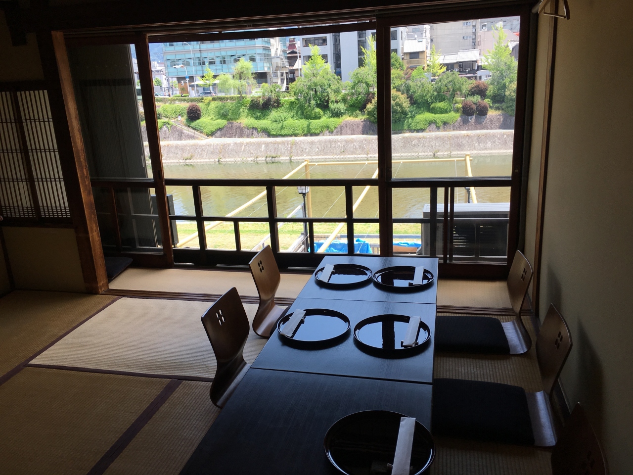 先斗町の中ほどで鴨川に面した料亭でランチタイムに訪れた。玄関には花街らしく芸妓さんの赤い団扇が何枚も飾られている。川床の納涼床を期待したがお昼の納涼床は5月と9月のみで、鴨川を見ながらの部屋食になった。