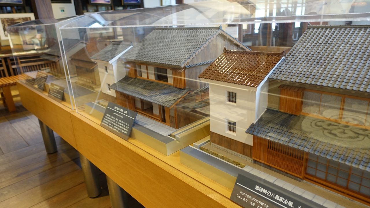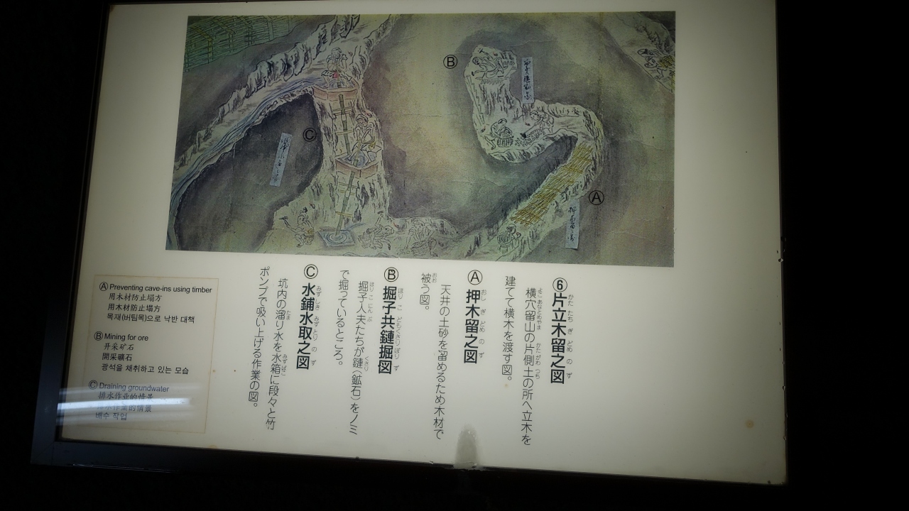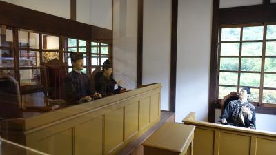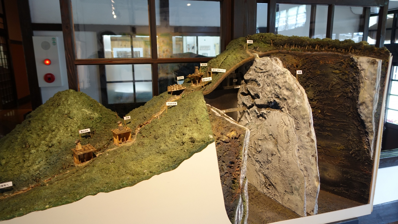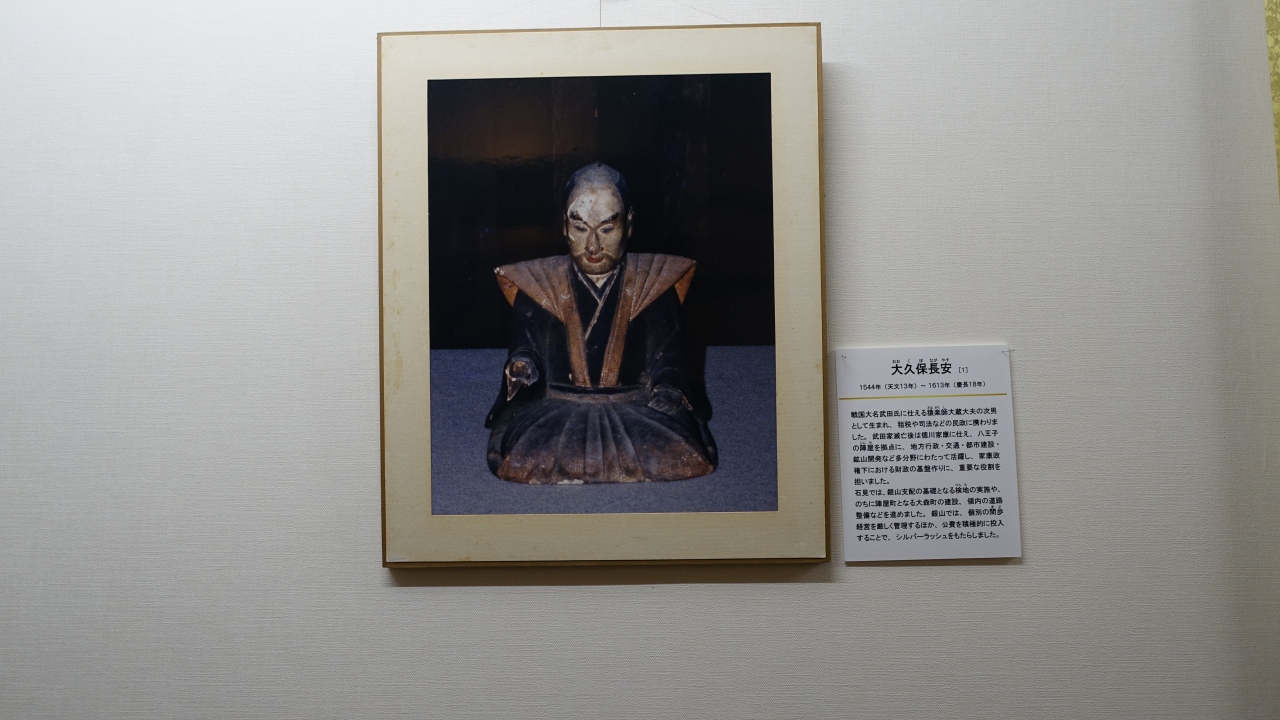 大森代官所があった場所に明治 35 年築の旧迩摩郡役所の建物を移築し、石見銀山資料館として公開されている。内部は廊下を挟んで両側に展示室が並びまるで学校のよう。銀山のジオラマや、石見銀山開発の中心人物大久保長安、「いも代官」こと井戸平左衛門など、銀山ゆかりの人物が紹介されている。