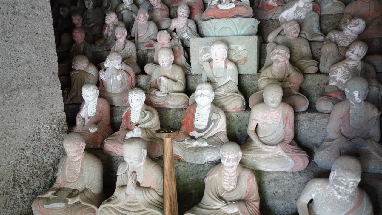 羅漢寺から銀山川の支流に架かる反り橋を渡った対岸に五百羅漢がある。柔和な表情の石仏がぎっしり並んでいるが、銀山で過酷な労働の末に亡くなった人々が、せめてあの世では安らかに、との願いが込められていると思うと悲しくなる。銀山で働く労働者の大半は罪人だったと思われる。室町から戦国時代にかけては一般庶民は盗みでもしないと生きていけない過酷な時代だったはずだ。- 旅行時期
