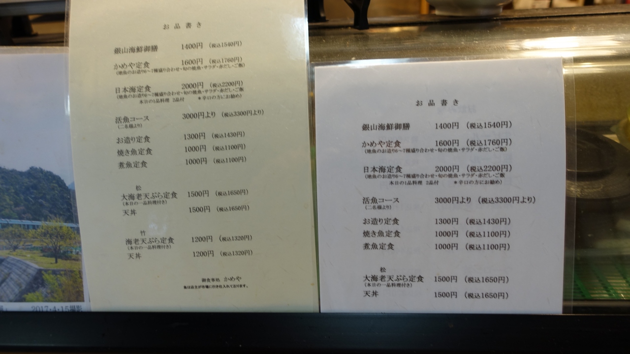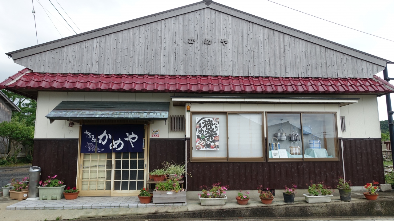 JR山陰本線仁万駅から徒歩10分にあるお魚処。列車の待ち合わせ時間を利用して昼食を頂いた。特に目立たない地元の小料理屋といった感じだが、店主自ら地元の漁港でセリ落とした地魚を食べさせてくれる。「かめや定食」を注文したが、付け出し、地魚の盛り合わせ、本日の旬の魚(この時はサヨリの塩焼き)、最後にサラダ、赤だし、ご飯がついて1600円は超お得。魚も新鮮でコリコリして美味しかった。他に煮魚とビール2杯を追加注文して5000円からお釣りがきた。他にもいろんなセットメニューがあり、どれもリーズナブルな値段設定だった。