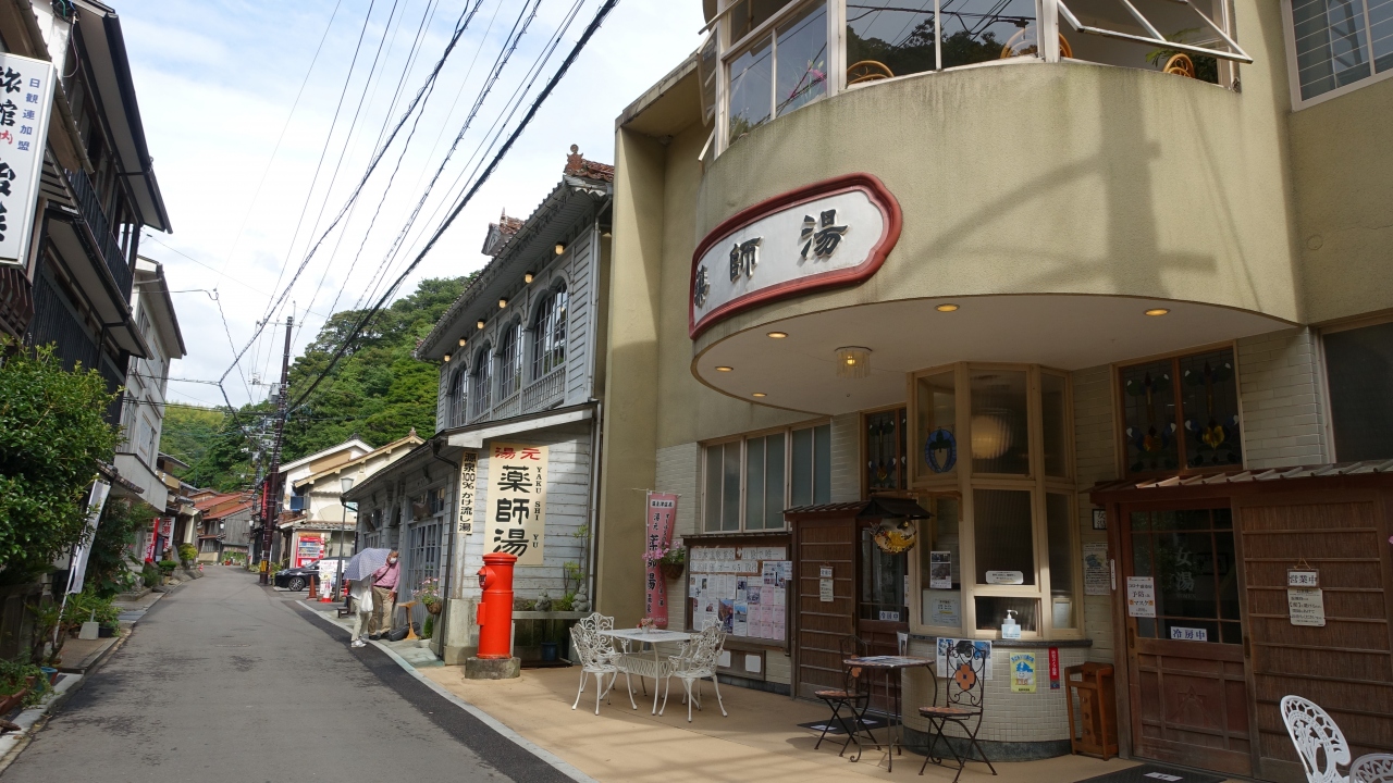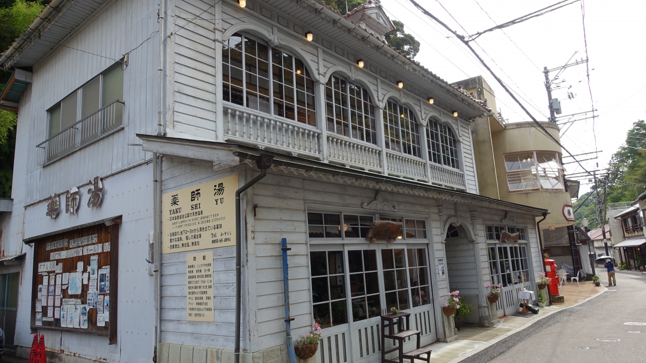 泉質と並んで素晴らしいのが建物。大正モダンの湯屋で2階は円形ガラス張りの休憩所になっており、眺めのいいオープンテラスには椅子やテーブルが置かれている。湯屋に隣接した木造洋館は大正8年築の薬師湯の旧館「震湯」で、現在はカフェになっている。屋根には当時流行したと思われる小さな塔がある。古き良き日本の温泉街の中でこの洋館は違和感なく馴染み、温泉街随一のフォトスポットである。- 旅行時期
