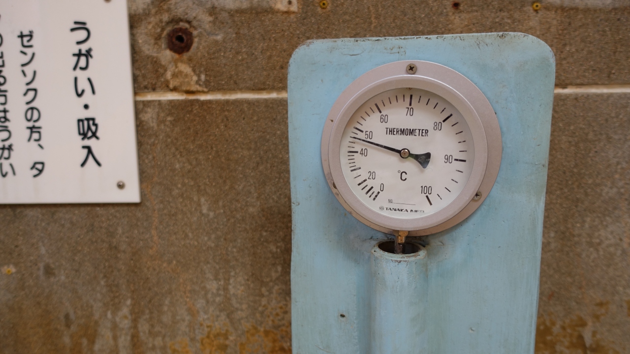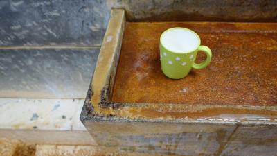浴槽や床には薬師湯同様に茶色の温泉成分が結晶している。湯船は源泉が直接注がれる「熱い湯」と少し冷ました「ぬるい湯」の2つ。ぬるい湯と言っても43℃あるので、最初に温度調節したこの小さな湯船で体を慣らすとよい。飲泉が可能で、浴室の蒸気を吸い込むのも効果があるという。