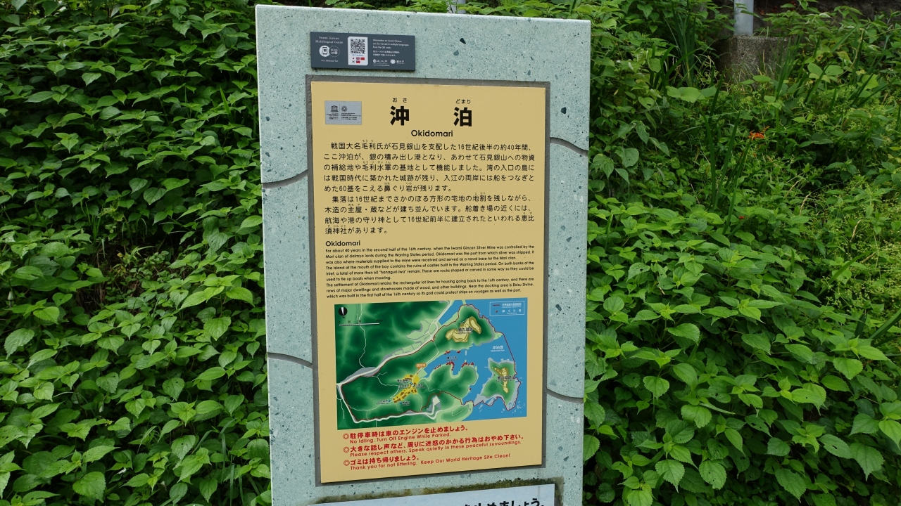 沖泊は石見銀山柵から西に直線距離で8.8km。毛利家が銀山を支配していた時代に、銀の積み出しと銀山への物資補給が行われた港で、銀を運んだ山越えの街道共々世界遺産の構成要素になっている。船着き場前の小さな広場には航海安全を祈願した恵比寿神社と、舟に必要な水を汲んだと思われる古井戸が残っている。リアス式海岸のため港は静かで、船を係留する綱を通すために海岸の岩に穴を開けた「鼻ぐり岩」が今も残っている。