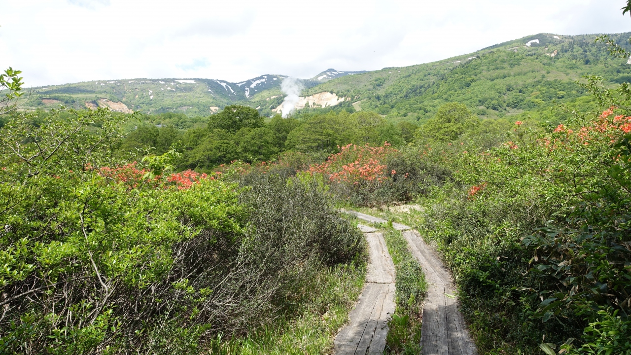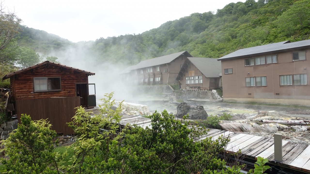 温泉を楽しんだ後は宿の奥にある一周2.7kmの自然探求路の散策がおすすめ。この一帯は火山活動が活発で「オナメ・モトメ」、「紺屋地獄」「大泥火山」「大湯沼」といった見どころがある。初夏には水芭蕉やコバイケソウの群生を見ることが出来る。- 旅行時期
