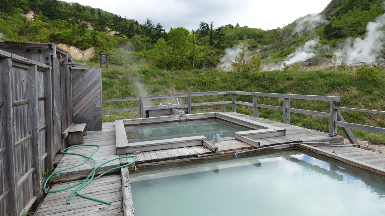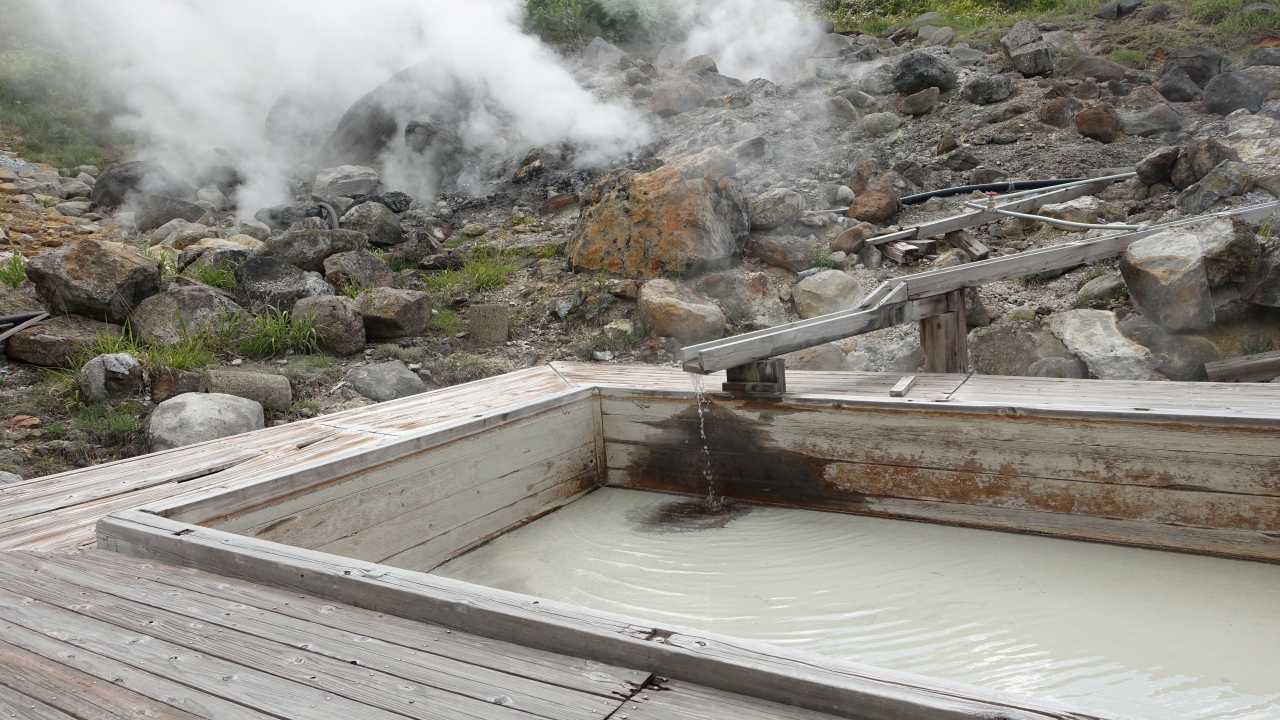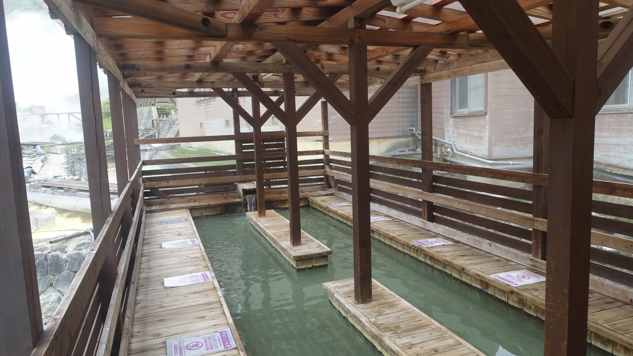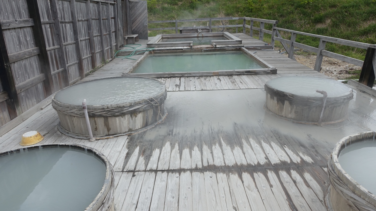 温泉は建物から少し離れた火山地帯の中に点在し、単純泉、弱酸性泉と泉質の異なる3本の源泉がある。ワイルドな野天風呂は乳白色の濁り湯で、屋根がないため解放感抜群。簡単な目隠しと床板が張られた場所には四角い桝風呂、丸い桶風呂が並んでいる。他にも岩風呂、内風呂、露天風呂、オンドルがあるらしい。- 旅行時期