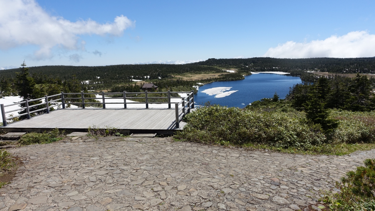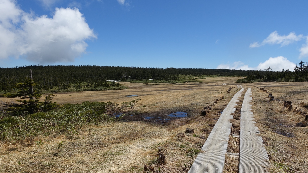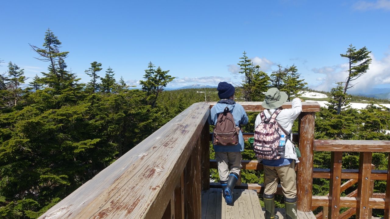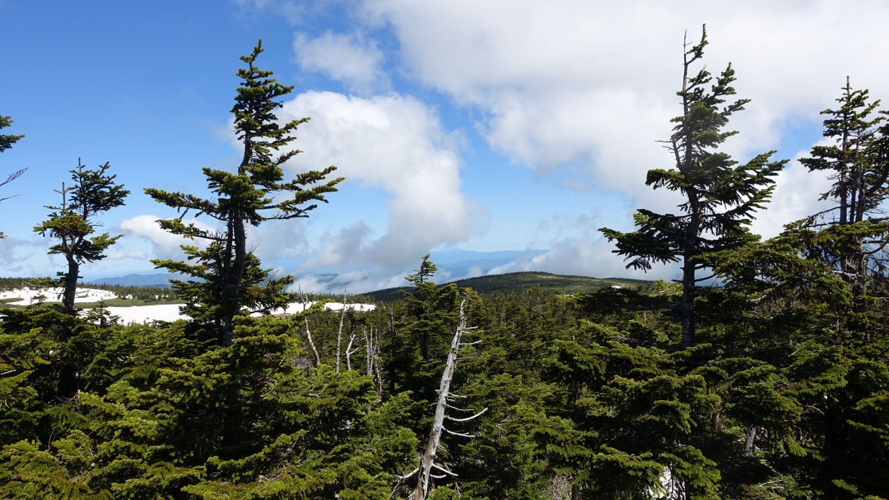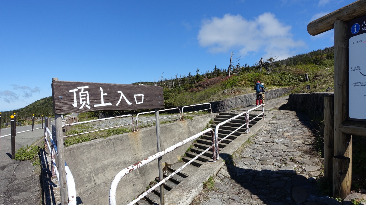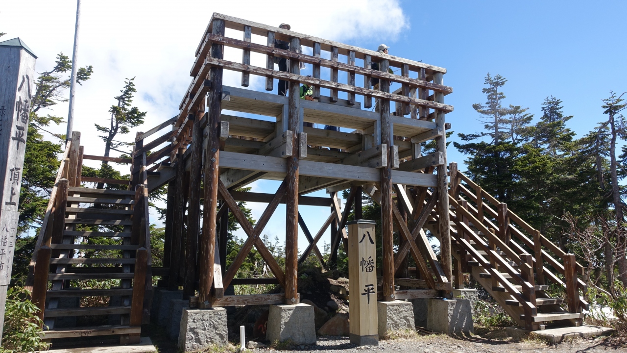 八幡平山頂レストハウス前の登山口からドラゴンアイの鏡沼を通り徒歩30分で行ける。途中は大した登りもなく知らないうちに山頂に着いた、といった感じ。その分山頂は平らで櫓を組んだ展望台があるが、周囲はアオモリトドマツの森でその間に僅かに山が見える程度と眺望は期待できない。にもかかわらず八幡平は日本百名山になっている。深田久弥が「のんびり逍遥するのがのが楽しい山」と評している通り、ここから八幡沼や周囲に広がる高層湿原まで周遊するのがいい。