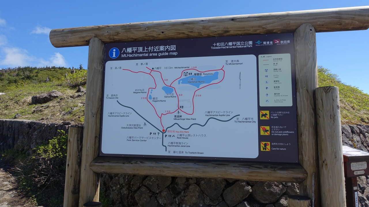 八幡平は火山台地に出来たなだらかな丘陵でアオモリトドマツの森、噴火で出来た大小の湖沼群、高層湿原がある。これらを辿るハイキングルートが八幡平山頂遊歩道である。スタートとゴールは八幡平アスピーテラインの秋田と盛岡の県境にある登山口で、傍の八幡平山頂レストハウスには広い駐車場がある。
