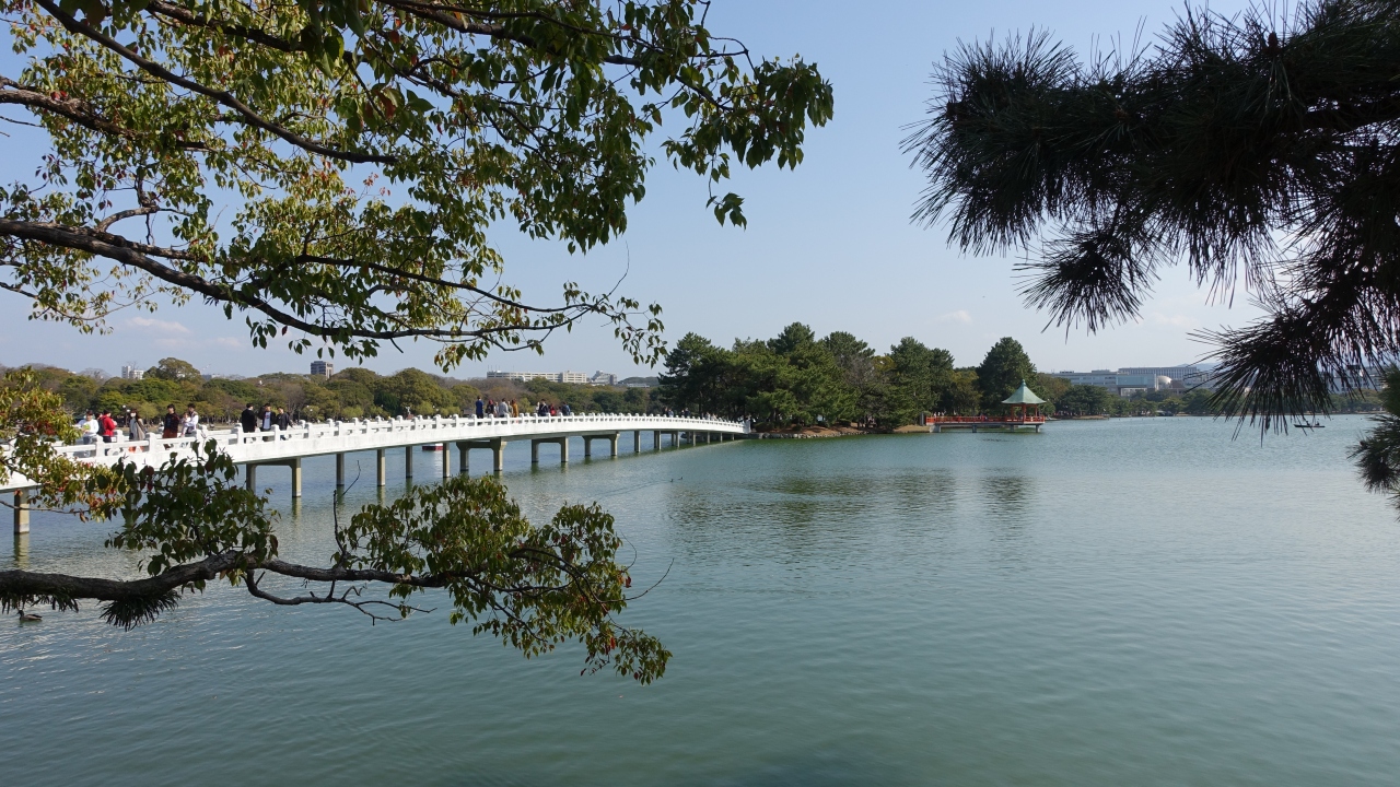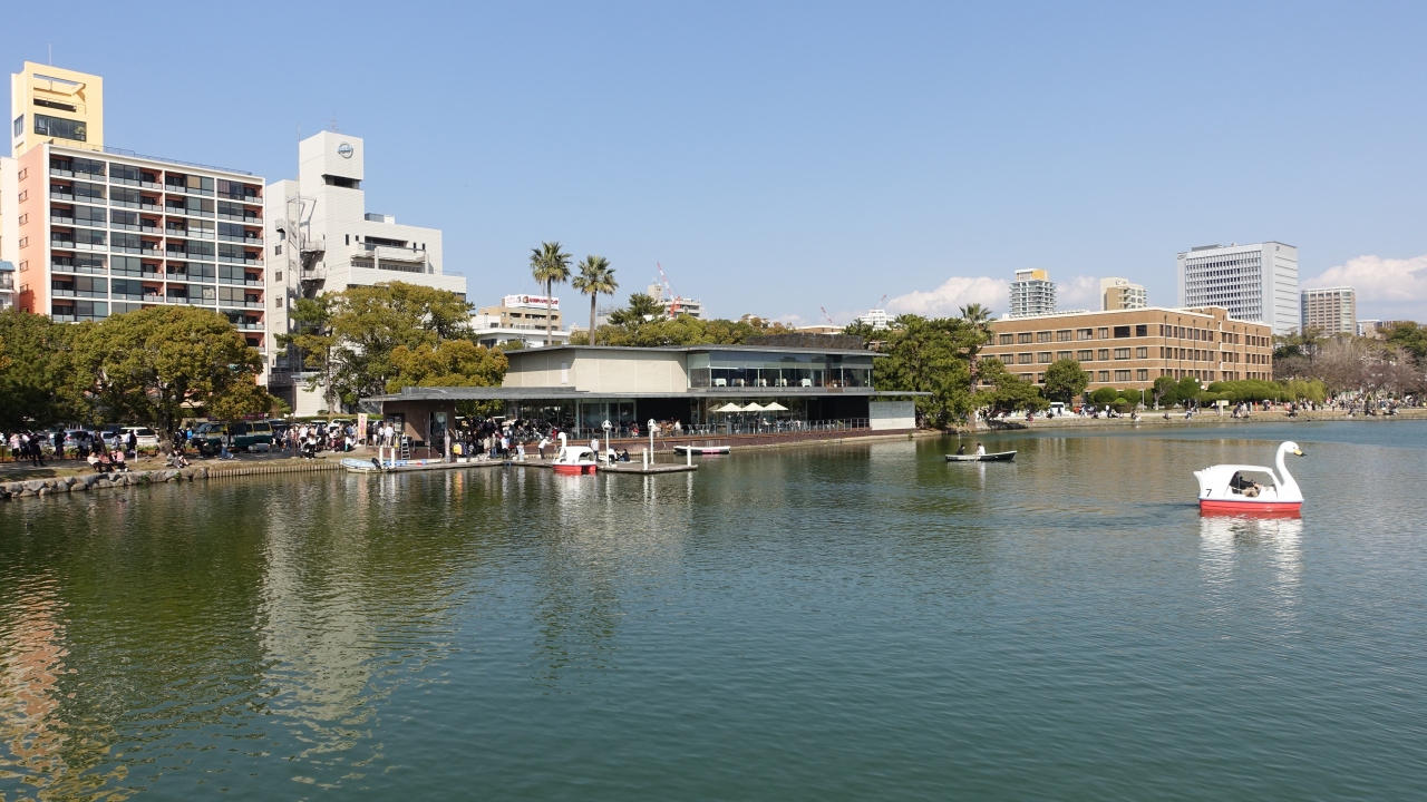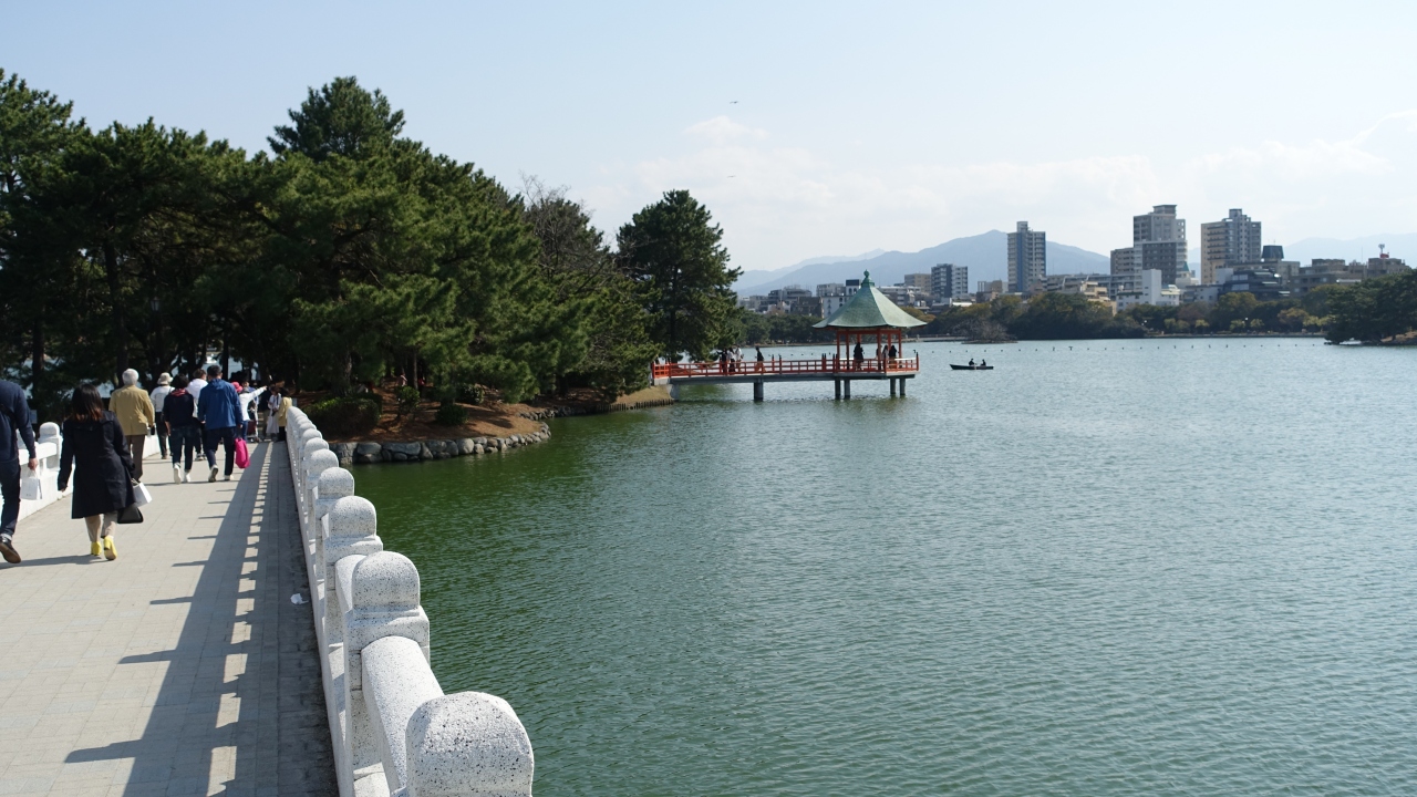 福岡都心のど真ん中にある水と緑の公園。昭和4年の開園以来福岡市民のオアシスとして親しまれている。中国の西湖にみたてた広大な池には南北に3つの島が造られ、これらを4つの橋が結ぶ。池の周囲は2kmのジョギングロードになっており、夕方に来ると高校駅伝の名門・筑紫女学園高校の部員が声をかけながら練習している。池の周囲には能楽堂、和風庭園、福岡市美術館などの文化施設がある。以前には夏に盛大な花火大会が模様され夏の博多の風物詩であったが、5年程前から廃止になったのは残念。