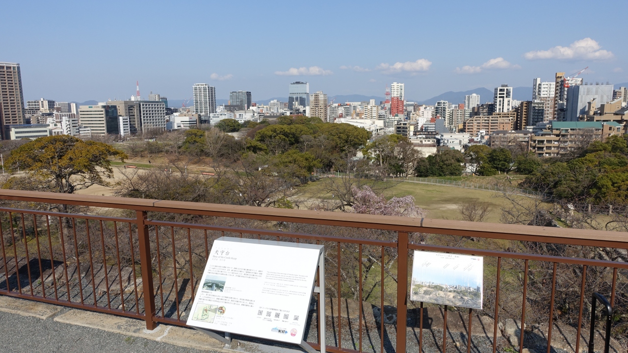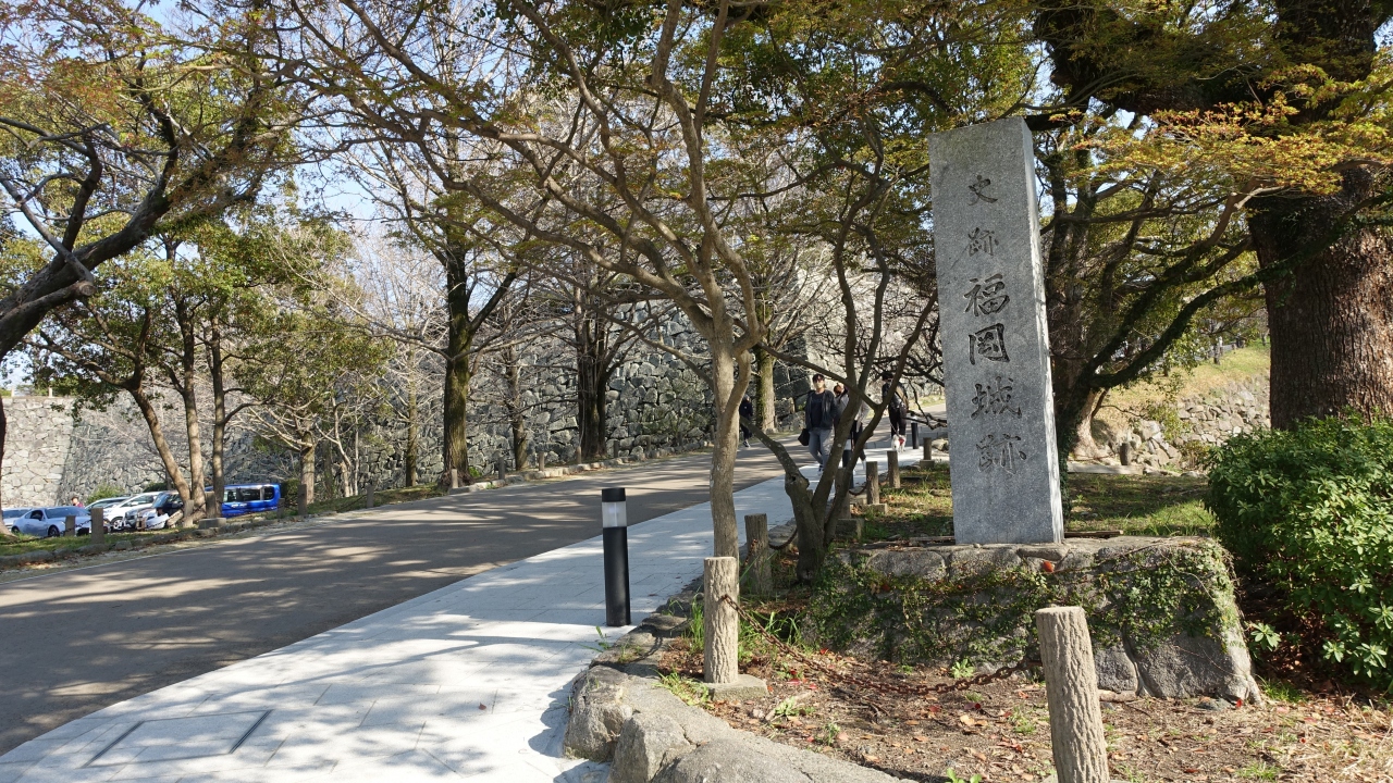 関ヶ原合戦で戦功のあった黒田長政が筑前一国50万石を拝領し、この地に新しく城を築いた。城は東西1km、南北700mと日本有数の規模で美しい石垣は総延長な3kmにも及ぶ。ただ城郭で残っているのは下之橋御門、名島門、潮見櫓くらいで、天守閣は築城時から幕府に遠慮して造らなかったらしい。天守台に上ると福岡の市街が一望できる。二の丸公園や三の丸公園は梅、桜、牡丹等四季折々の花が楽しめ、城を取り巻くお堀には夏には清々しい睡蓮が咲く。