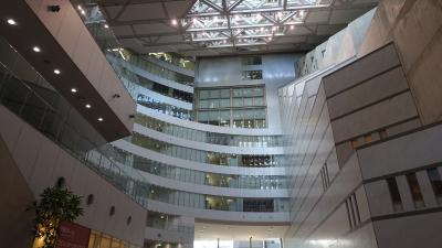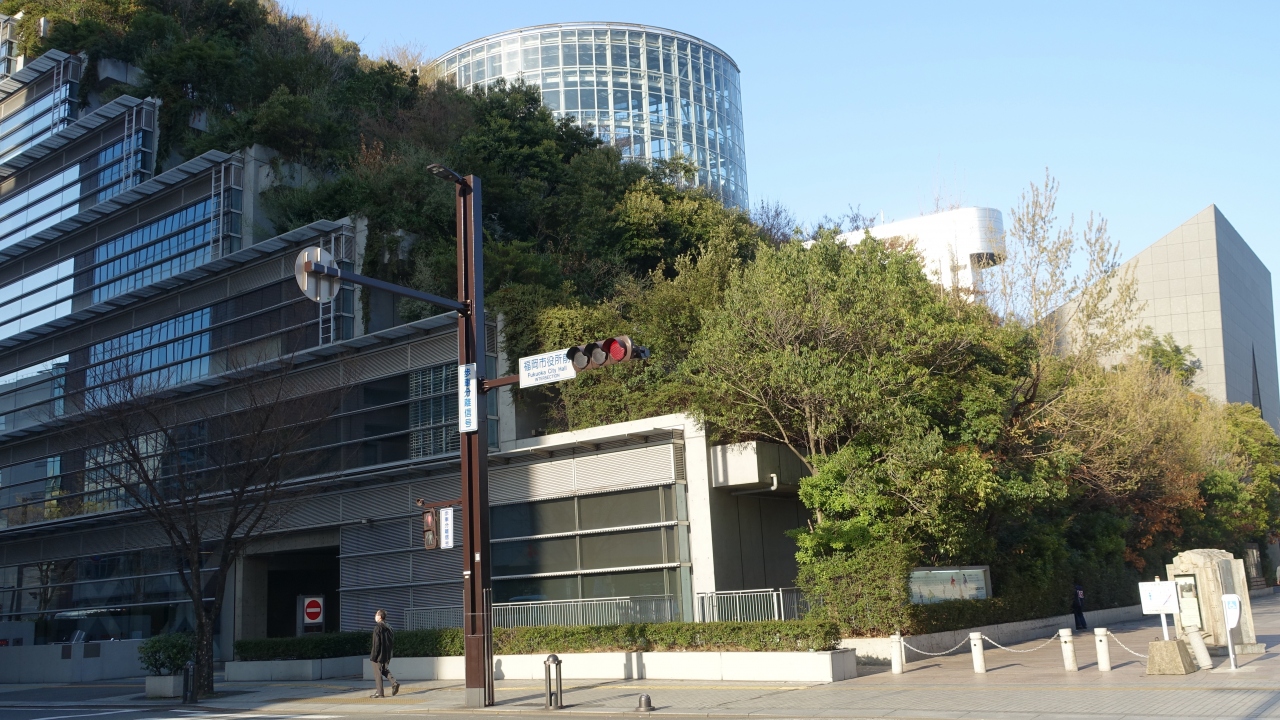 アクロス福岡は福岡県庁の跡地に1995年に建築された複合ビル。自然との共生、心潤う空間づくりをテーマにしており、地上13階の建物の南面は全面緑化されたステップガーデンになっており、南側の天神中央公園から見ると都会の中の山のようである。